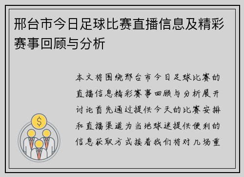 邢台市今日足球比赛直播信息及精彩赛事回顾与分析