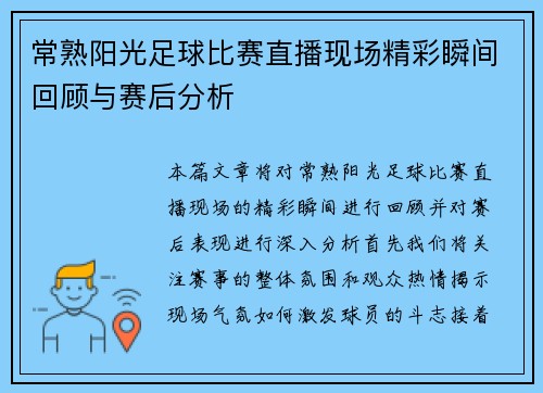 常熟阳光足球比赛直播现场精彩瞬间回顾与赛后分析