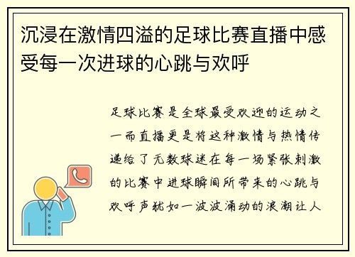 沉浸在激情四溢的足球比赛直播中感受每一次进球的心跳与欢呼